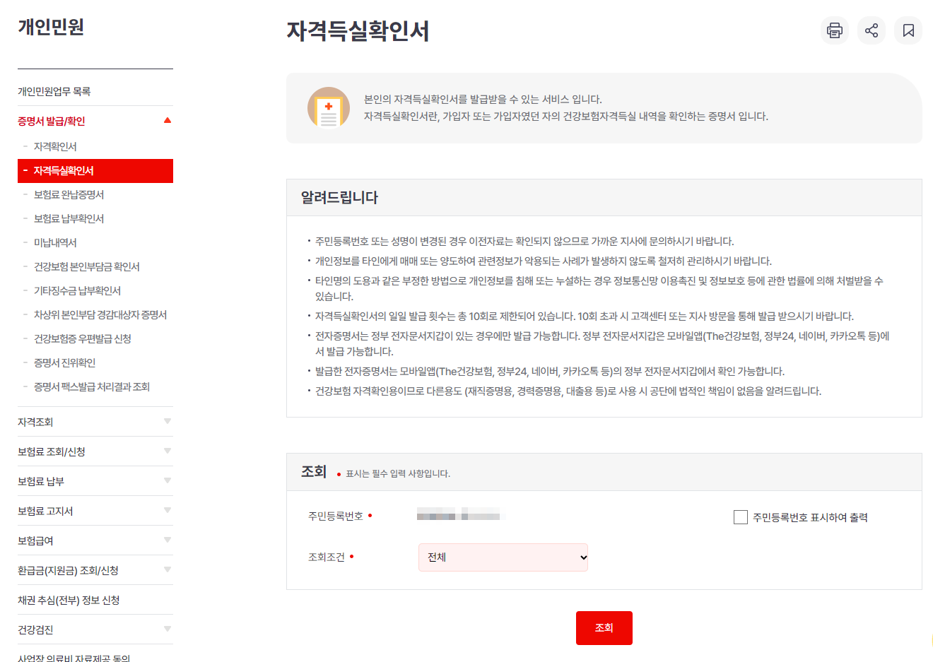 TIP: 이름이나 주민등록번호가 개명·변경되었다면, 발급 전 건강보험공단에 확인해야 합니다.