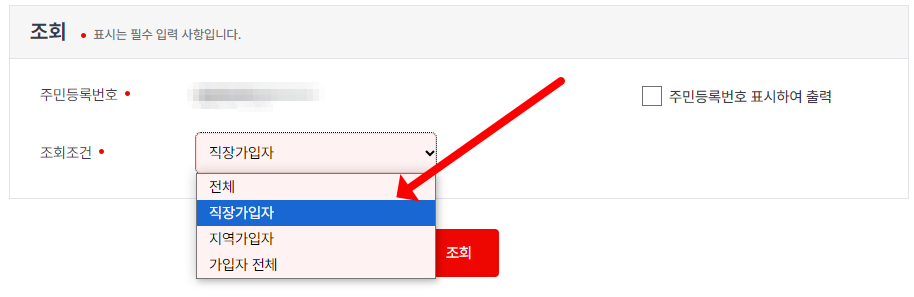 주민등록번호를 입력하고, 조회 조건을 선택합니다. 선택 가능한 조건은 다음과 같습니다: