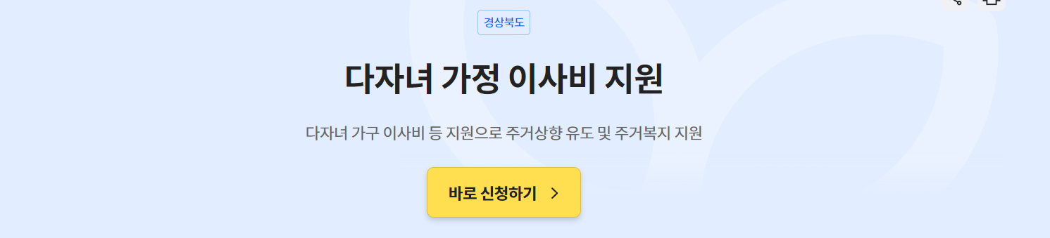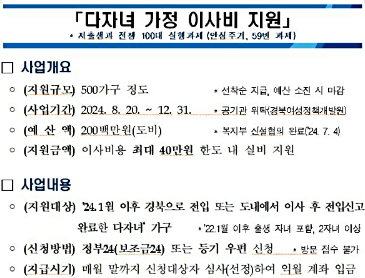 - 지원 대상: 2024년 1월 이후 경상북도로 이사하거나, 경북 내에서 이사를 완료한 2자녀 이상의 다자녀 가구가 해당됩니다.