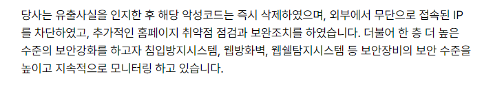 - 보안 시스템 강화: 웹 방화벽, 침입 방지 시스템, 웹쉘 탐지 시스템 등 다양한 보안 장비의 수준을 높여 추가적인 공격을 방지하고 있습니다.