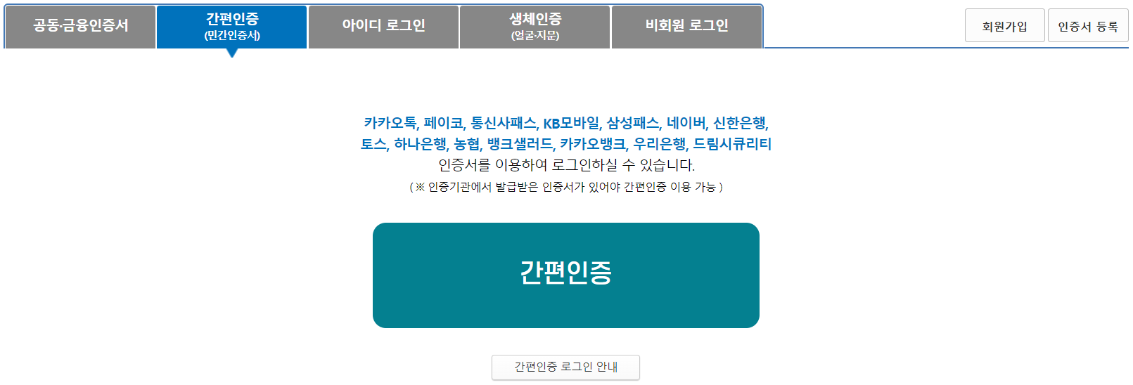 - 간편인증 (카카오, PASS, 네이버 인증서 등)