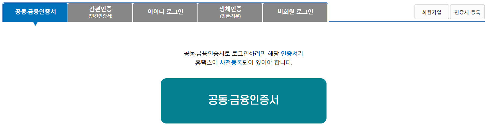 홈택스 사이트에 접속한 후 로그인이 필요합니다. 다음 방법 중 하나를 선택해 로그인할 수 있습니다.