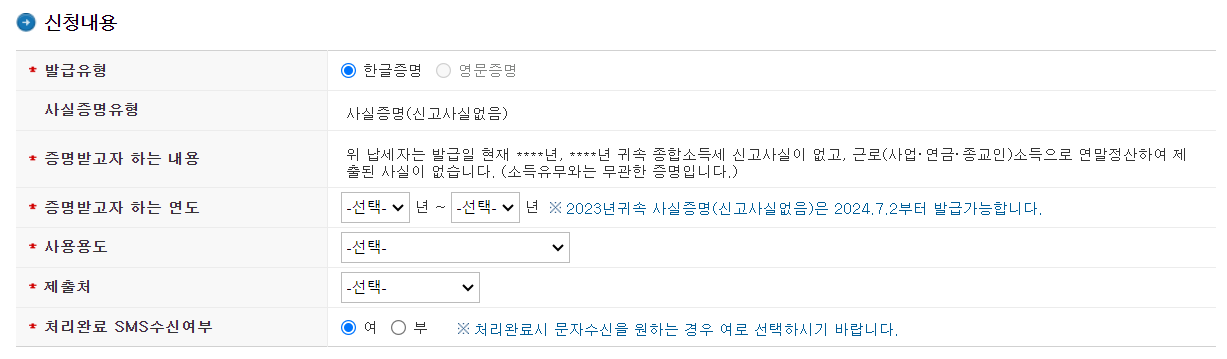무소득 사실증명은 최근 몇 년 동안 소득이 없음을 증명하는 문서이므로, 발급할 때 필요한 연도를 신중하게 선택하시기 바랍니다.