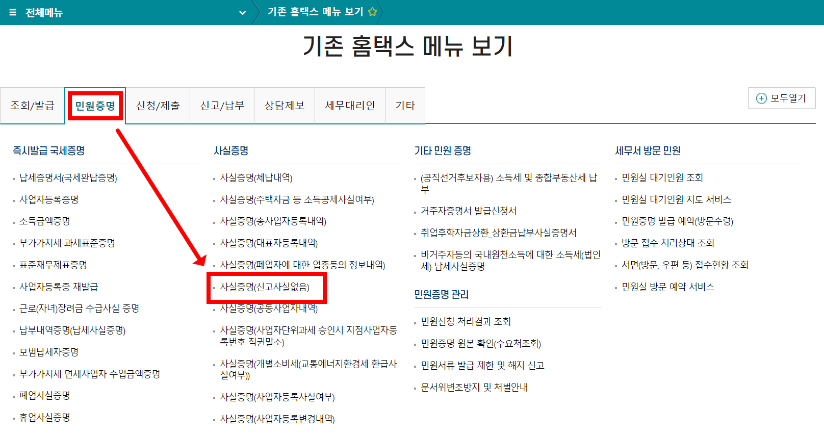 민원증명 메뉴 중에서 사실증명(신고사실없음) 항목을 찾아 클릭합니다.여기서 소득이 없다는 사실을 증명할 수 있습니다. 참고로 홈텍스 업데이트 이후 무소득자의 신고 방식이 바뀌어, 예전에는 선택할 수 있었던 사실증명 항목 대신 이제는 ‘신고사실없음’으로 신고해야 합니다. 따라서 무소득자는 더 이상 특정 사실증명을 선택할 수 없고, 단순히 신고사실없음을 입력해야 합니다.