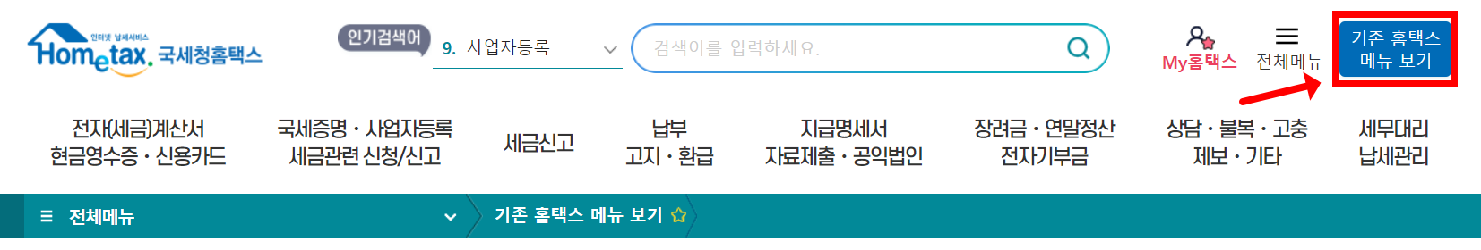 홈택스 메인 페이지에서 오른쪽 상단에 있는 [기존 홈택스 메뉴 보기]를 클릭합니다.
