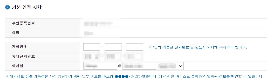 기본 정보를 입력하고, 발급받고자 하는 연도를 선택합니다. 제출해야 할 기관에 따라 주민등록번호 공개 여부 등을 선택하세요. 필요한 사항을 모두 기입한 후 신청하기 버튼을 클릭합니다.