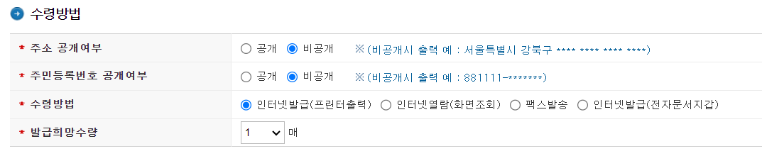 신청서 작성이 완료되면 발급 방식을 선택할 수 있습니다. PDF 파일로 다운로드하거나 프린터로 출력할 수 있으며, 팩스 발송도 가능합니다.