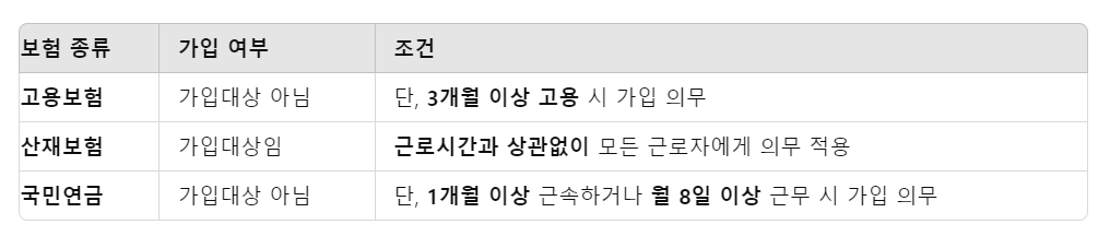 보험 혜택도 놓칠 수 없습니다. 초단시간근로자는 고용보험과 산재보험 적용이 다릅니다.