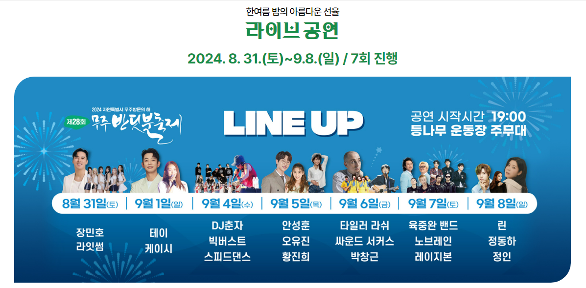 화려한 가수 라인업과 전국노래자랑 본선 녹화가 펼쳐지는 2024 무주 반딧불 축제! 장민호, 테이, 린, 박서진 등 최고의 가수들이 무대를 뜨겁게 달구고, 매일 밤 신나는 EDM 파티가 이어집니다. 반딧불이 탐사부터 화려한 불꽃놀이까지, 이번 축제에서 놓칠 수 없는 공연과 행사를 한눈에 확인하세요! 셔틀버스 정보와 공연 스팟 예약으로 더욱 편리하게 즐겨보세요.