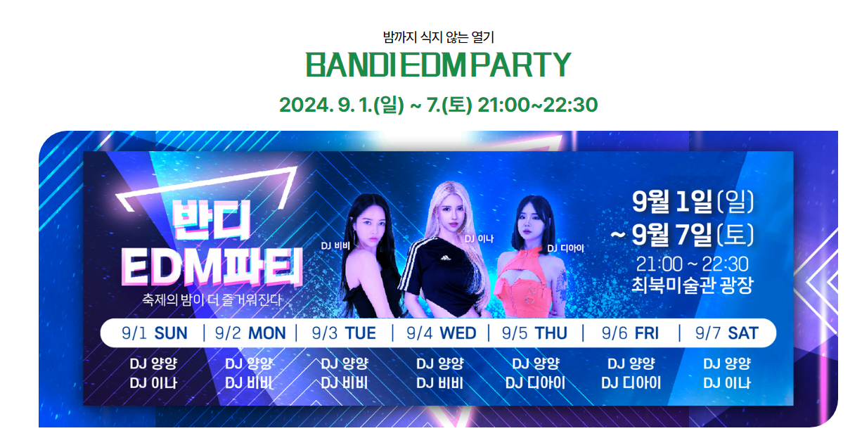 매일 밤 열리는 EDM 파티는 최북미술관 광장에서 9월 1일부터 9월 7일까지 열리며, DJ 양양, DJ 이나, DJ 비비 등의 공연이 이어집니다.