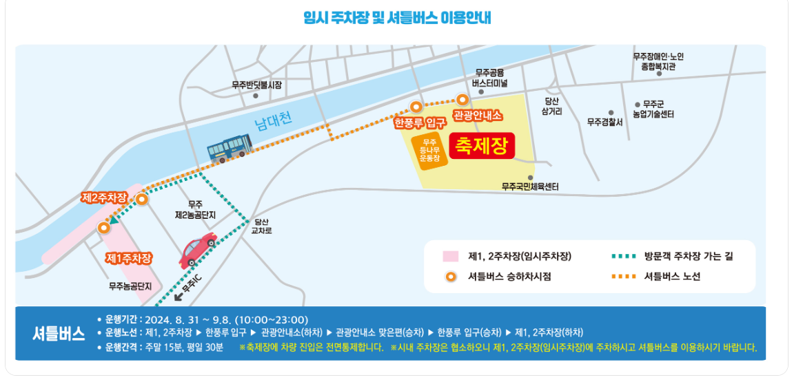 축제 기간 동안 무료 셔틀버스가 운행되며, 주말에는 15분 간격, 평일에는 30분 간격으로 운영됩니다. 무주 제1농공단지와 제2농공단지에서 출발하여 축제장까지 연결됩니다.