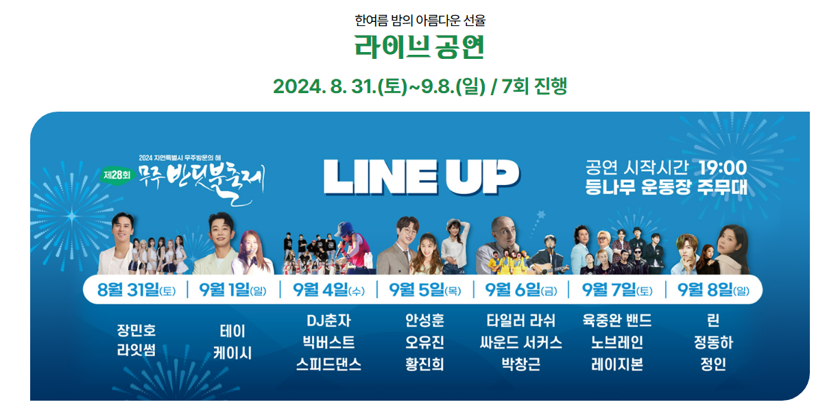 | 2024 무주 반딧불 축제: 가수 라인업 및 공연 시간 완벽 가이드 (날짜별 가수 공연) (0) | 2024.08.19 |