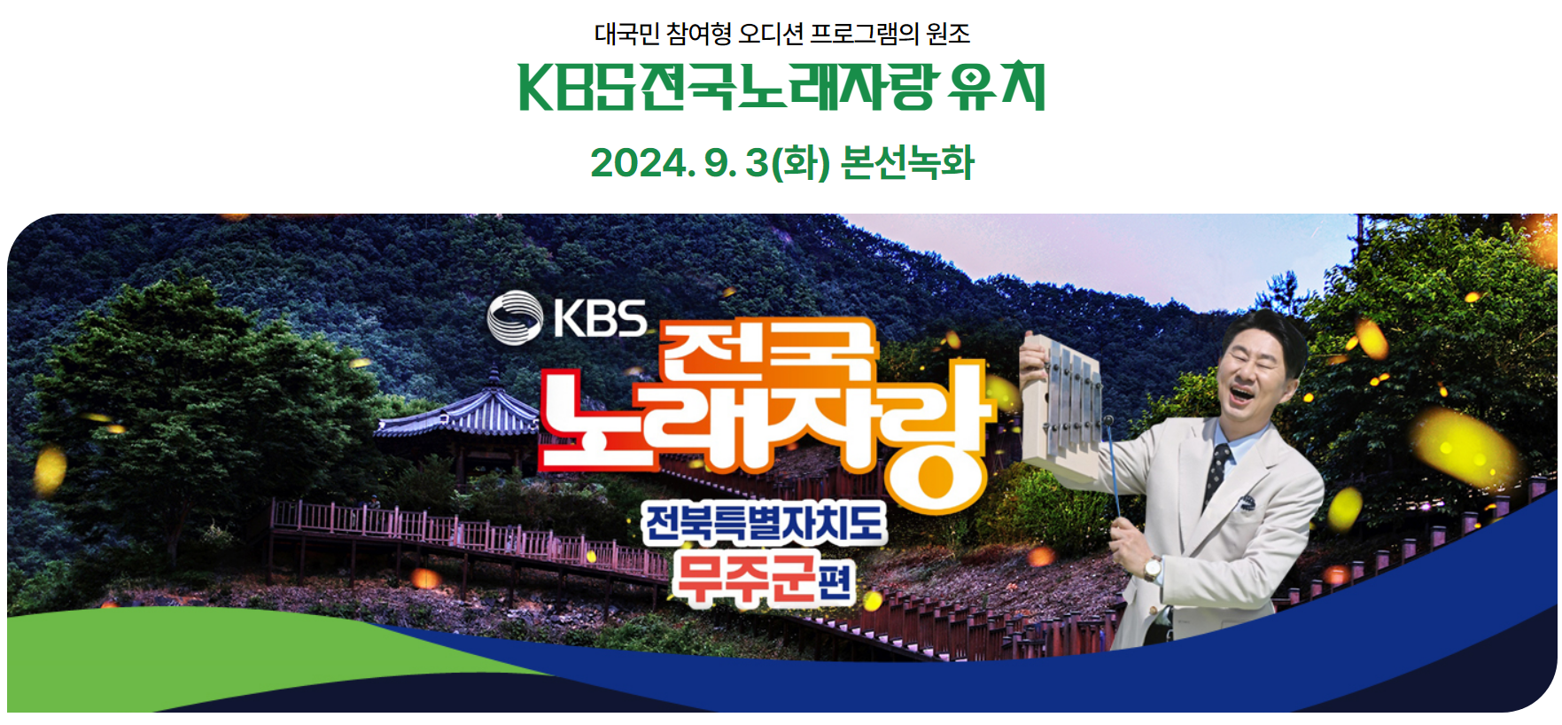 2024년 9월 3일, 무주 반딧불 축제에서 KBS 전국노래자랑 본선 녹화가 열립니다. 무주 등나무운동장에서 예선을 통과한 실력자들이 무대에 오르고, 현숙, 박서진 등 초대가수들이 특별한 무대를 선보입니다.