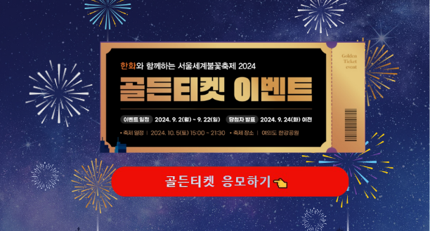 골든티켓은 VIP석에서 불꽃놀이를 편안하게 감상할 수 있는 특별한 기회입니다. 골든티켓을 얻으면 VIP 좌석뿐만 아니라 애프터 파티에도 초대되는 혜택을 누릴 수 있습니다.