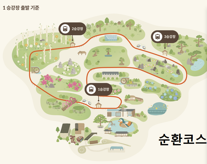 화담숲 모노레일은 화담숲의 언덕을 편안하게 구경할 수 있도록 설계된 교통수단으로, 총 3개의 승강장에서 운행됩니다. 1승강장에서 출발하여 2승강장과 3승강장을 순환하는 방식으로 운영되며, 중간 하차는 불가합니다.