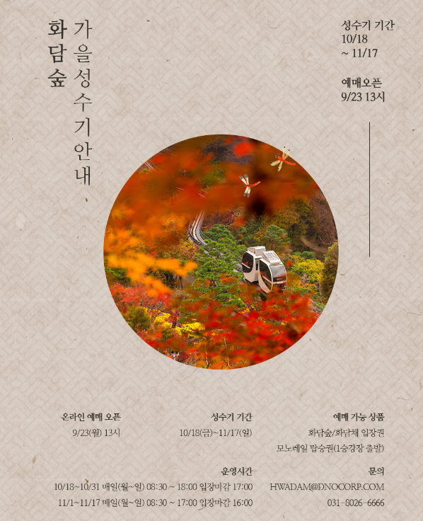 화담숲의 가을 성수기 예약은 9월 23일에 오픈되며, 예약 가능한 상품은 화담숲/화담채 입장권과 모노레일 탑승권입니다. 특히, 모노레일은 1승강장에서 출발하는 승차권을 미리 예약해야 하며, 2승강장과 3승강장의 탑승권은 무인발권기에서 구매할 수 있습니다.