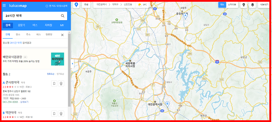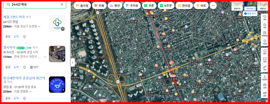 카카오 맵에서 '내 주변의 24시 약국'을 검색하면 자세한 위치, 영업시간, 전화번호, 리뷰, 사진 등 다양한 정보를 확인할 수 있습니다.