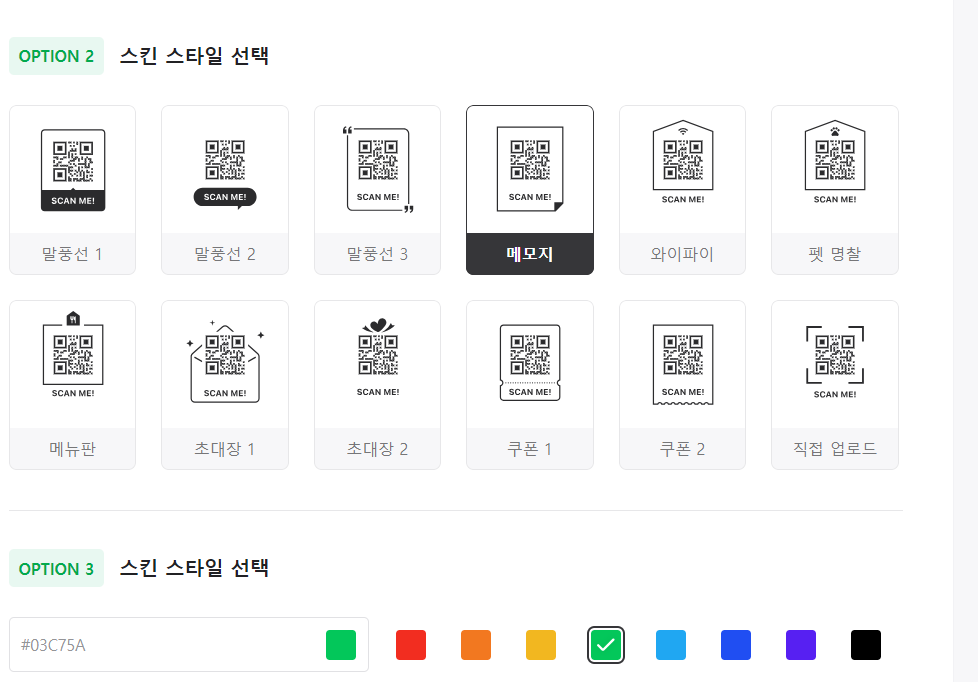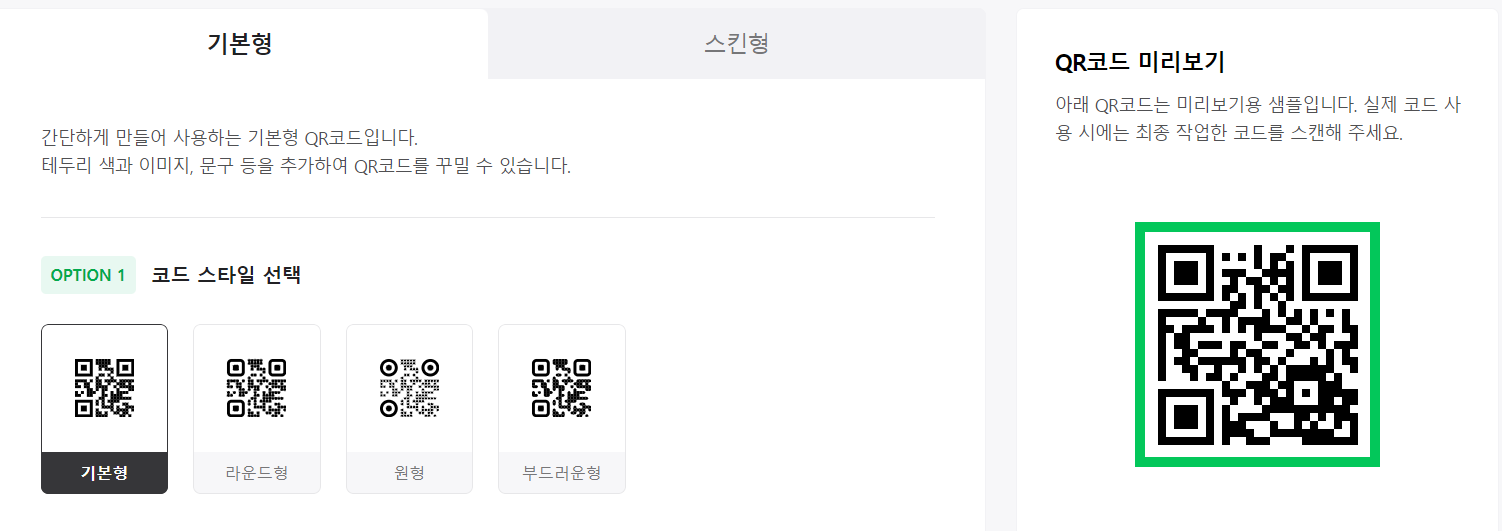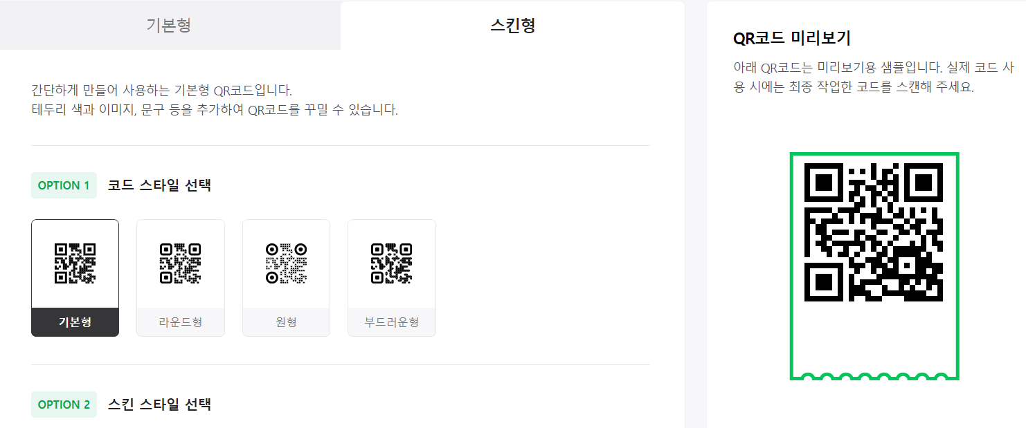 ④ 코드 스타일 스킨형은 QR코드를 둘러싸는 스킨을 선택할수있어요.