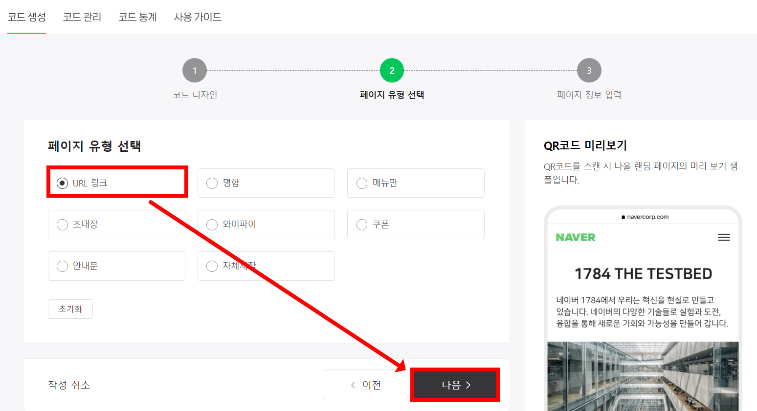 다양한 페이지 유형이 있습니다. URL 링크를 QR로 변형하는 작업중이므로 URL 링크 선택 후 다음으로 넘어갑니다.
