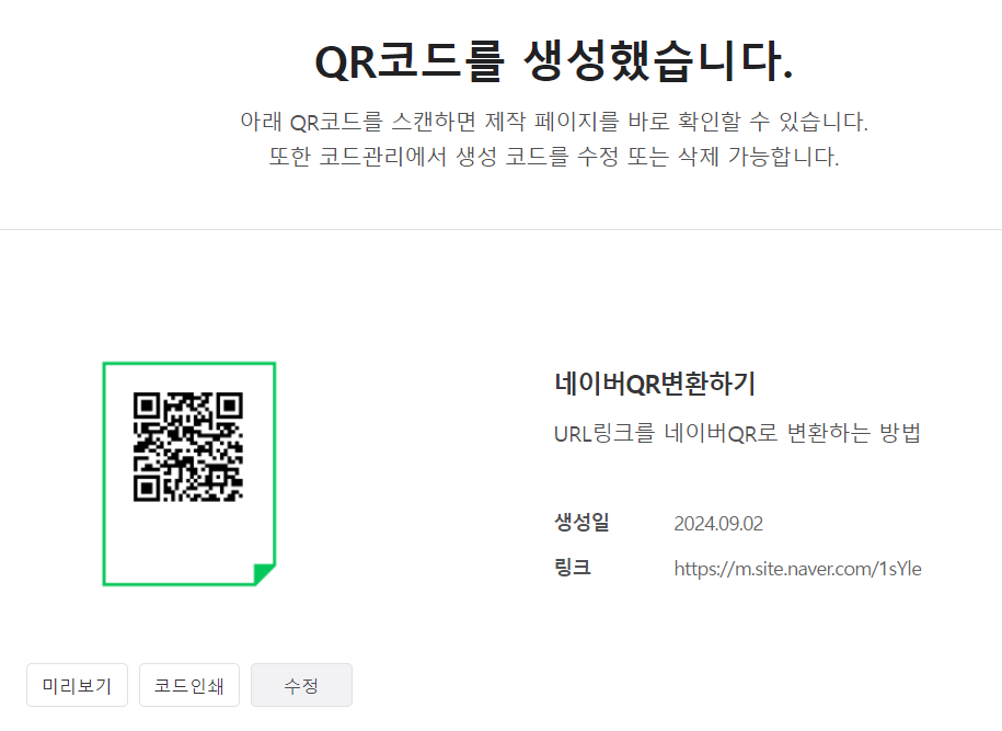 잠시 후, 생성된 QR 코드가 화면에 나타납니다. 이 QR 코드를 저장하기 위해 '코드인쇄' 버튼을 클릭하여 파일을 저장합니다.