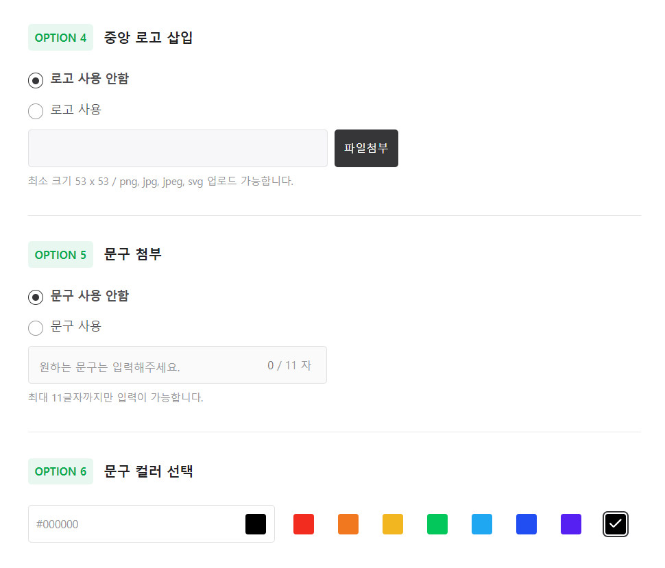 ⑤ 큐알코드 중앙에 로고/문구 삽입 여부 선택합니다. (없으면 사용안함 선택)