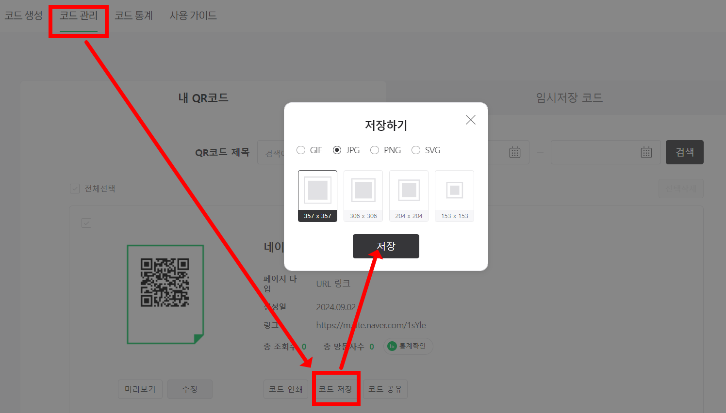 코드관리에 들어가면 생성된 코드가 나옵니다. 코드저장을 누르고 원하는 확장자 선택후 저장.
